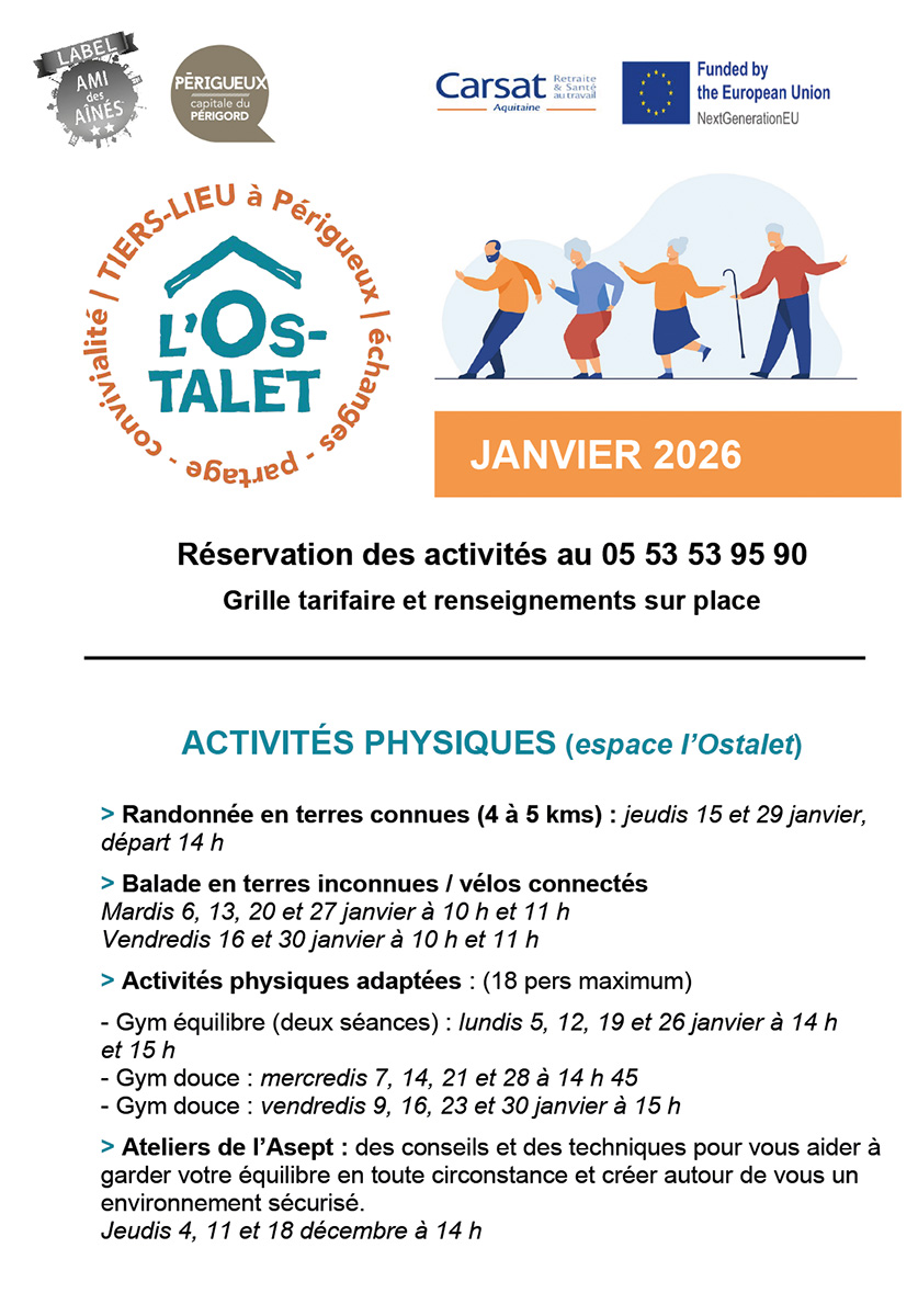 L’Ostalet est un tiers-lieu dédié intergénérationnel et point infos seniors de la ville de Périgueux, juxtaposé à la résidence seniors Wilson, à deux pas de l’Hôtel de Ville et de la place Louis Magne. Ce lieu, ouvert à tous, est un espace ressource pour échanger, se retrouver, se rencontrer. Cliquez ici pour télécharger le programme des activités du mois de janvier 2026 (format PDF)