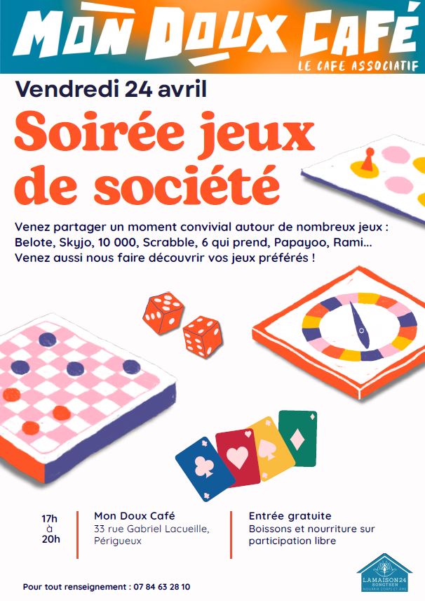 Soirée jeux de société au Mon Doux Café. Venez partager un moment convivial autour de nombreux jeux (belote, Skyjo, 10 000, scrabble, 6 qui prend, Papayoo, rami...), et venez nous faire découvrir vos jeux préférés. Entrée gratuite. Boissons et nourriture sur participation libre. Au local de La Maison 24, 33 rue Gabriel Lacueille, Périgueux.
