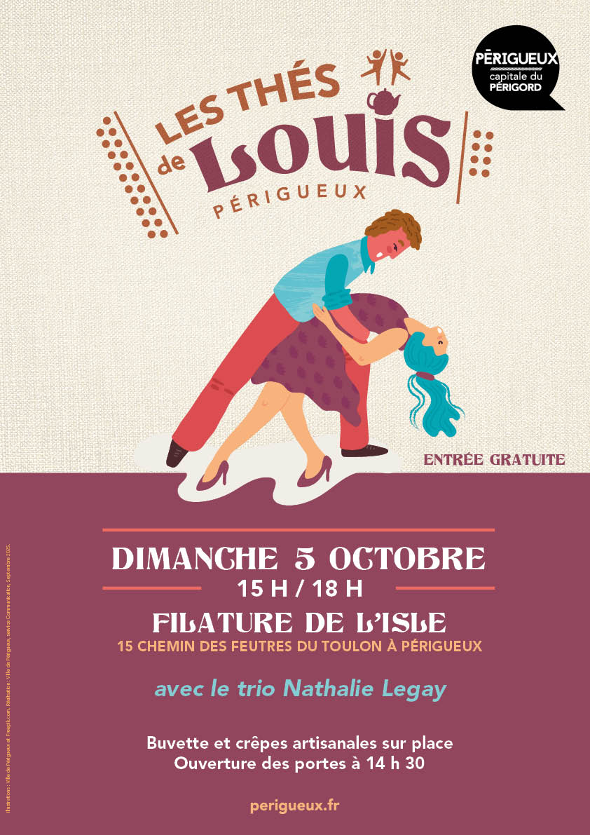 Thé dansant proposé par la Ville de Périgueux à la Filature de l'Isle, 15 chemin des Feutres du Toulon. Animation par le trio Nathalie Legay, buvette et crêpes sur place (restauration payante). De 15 h à 18 h, ouverture des portes à 14 h 30. Entrée libre et gratuite.