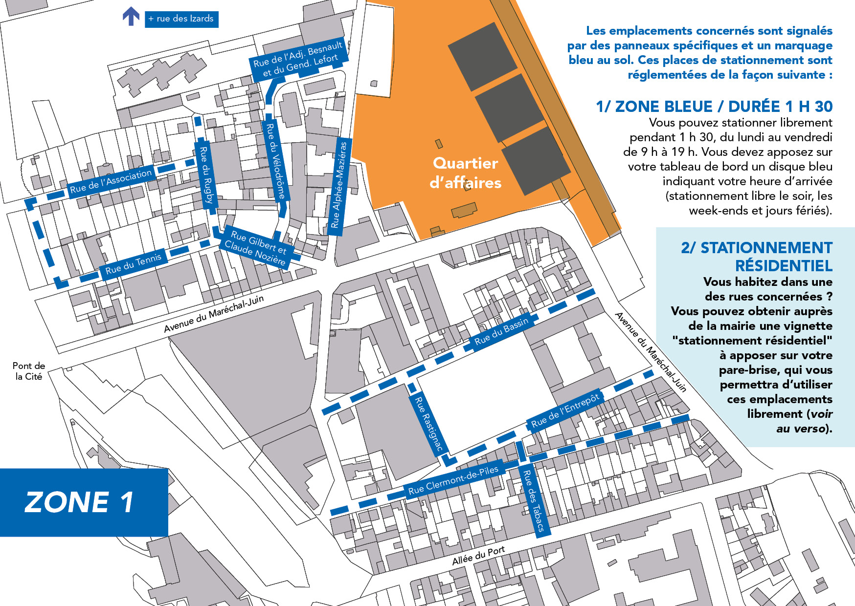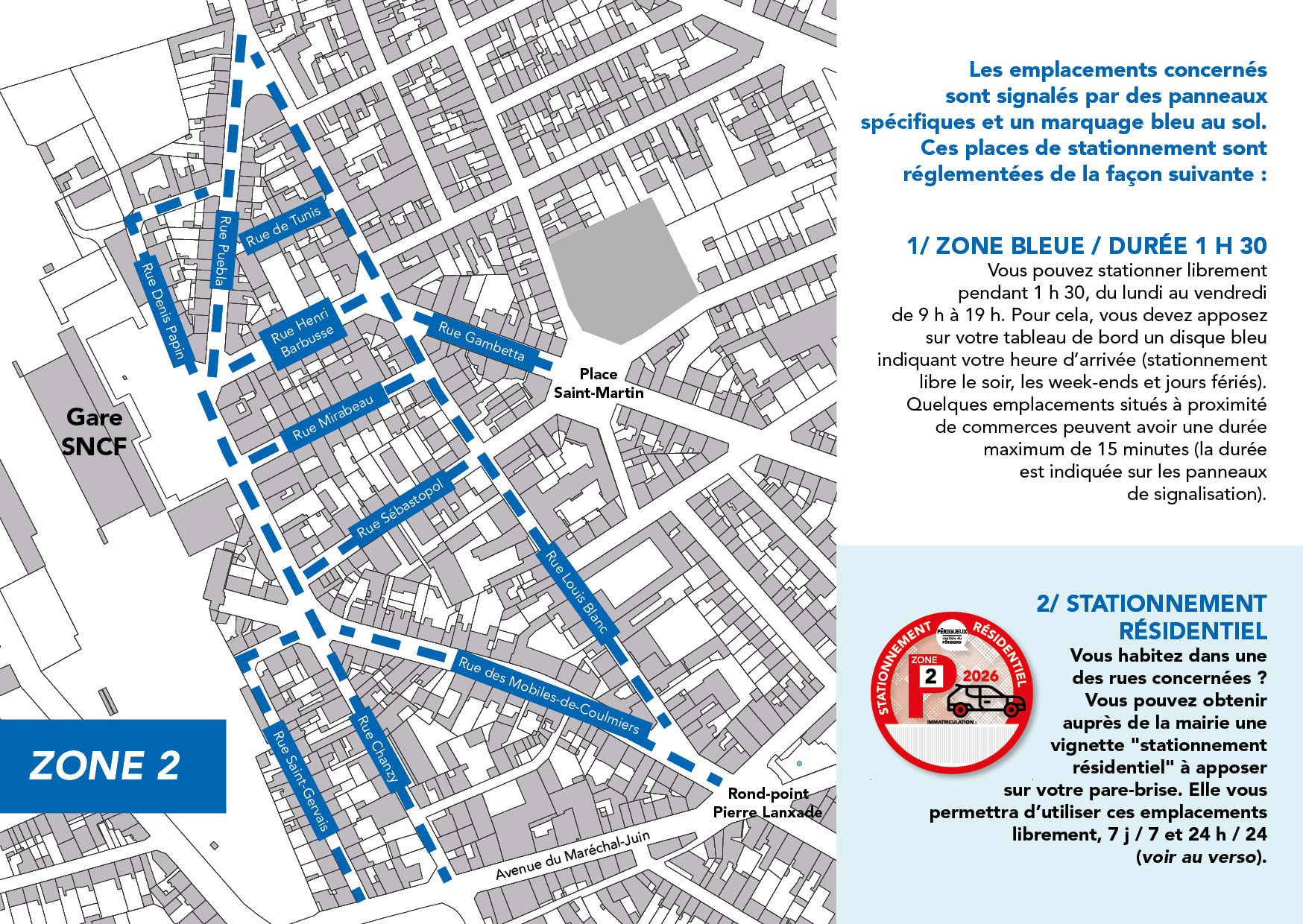 Afin d’accompagner au mieux l’émergence de nouveaux équipements publics dans le secteur de la gare (quartier d’affaires, navette ferroviaire etc.), la Ville de Périgueux a choisi de réguler les flux des véhicules en instaurant, à partir du 1er juin 2023, du stationnement en zones bleues, couplé à un système de stationnement résidentiel pour les riverains.