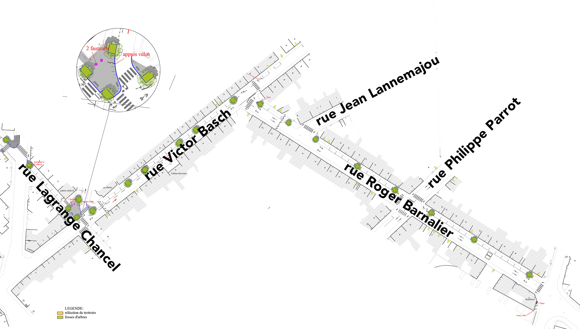 - aménagement du carrefour des rues Lagrange Chancel, Victor Basch et Pasteur en placette agrémentée d’arbres et d’assises et traversées piétonnes sécurisées ;