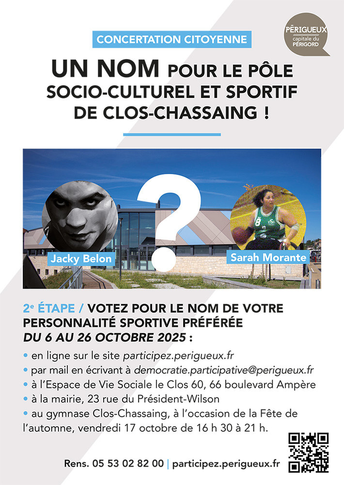 Situé au cœur du quartier Clos-Chassaing, à deux pas du centre-ville, le pôle socio-culturel et sportif a fait l’objet d’importantes transformations. Aujourd’hui, la Ville de Périgueux souhaite lui donner une identité propre en conviant les usagers et habitants du quartier à le nommer. Dans cette perspective, la 2e phase de la concertation citoyenne est lancée par le service démocratie participative du 6 au 26 octobre.