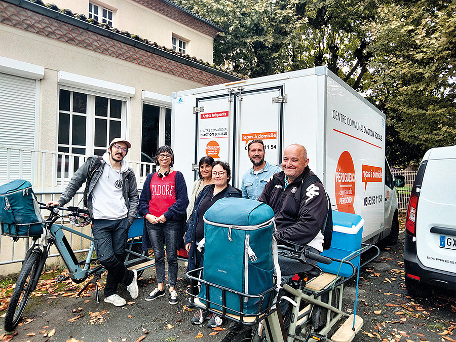 Depuis plus d'un an, le service de portage de repas à domicile du Centre communal d'action sociale (CCAS) de Périgueux a fait peau neuve en introduisant deux vélos cargo, équipés de glaciaires, pour assurer ses livraisons. Désormais, deux des trois tournées quotidiennes sont effectuées à vélo et offrent non seulement une alternative écologique aux déplacements mais surtout une solution pratique et rapide pour circuler et stationner devant chaque domicile. La troisième tournée est toujours effectuée à l'aide d'un camion frigorifique qui permet par ailleurs aux livreurs à vélo de se réapprovisionner en cours de journée.