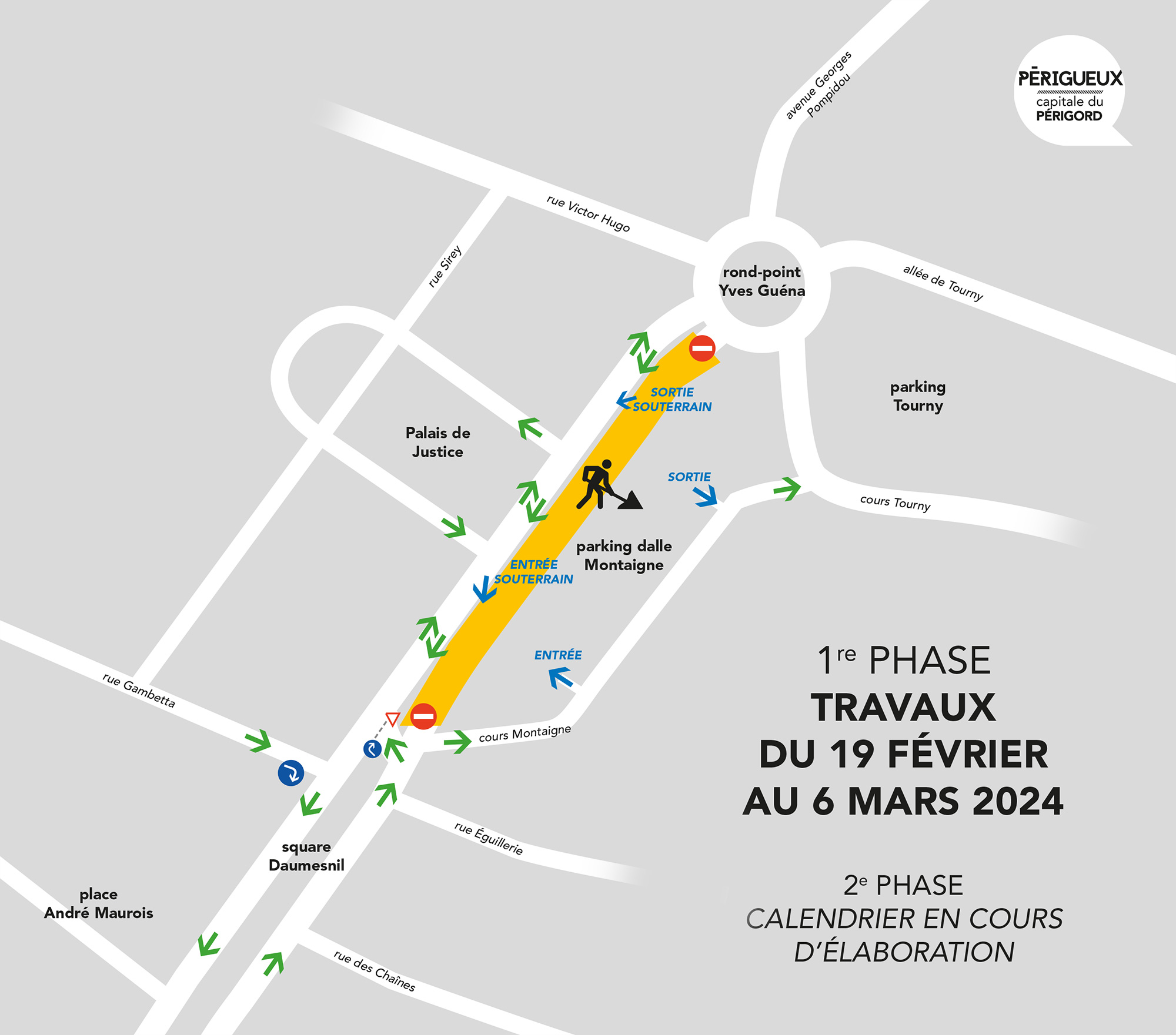 Le chantier a pour objectifs la mise en sécurité des voies de circulation (terrassement, reprise de la structure de chaussée et du revêtement) et l’amélioration des accès au parking et à la place Montaigne, notamment pour la mise en place du marché de la place de la Clautre qui sera dépaysé provisoirement à cet endroit à partir du 6 mars. Une voie dédiée aux bus et aux véhicules de secours, également accessible aux cyclistes sera aménagée.
